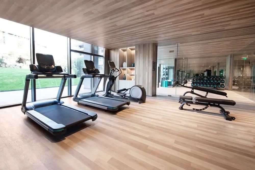 健身房拥有180°落地玻璃,抬眼即是户外庭院美景,现代木纹顶面,天地一色,相同色调打造统一的自然风格,简约时尚,配有齐全的健身设施,跑步机、立式健身车,椭圆运转机...度假之余也不要忘记锻炼身体!