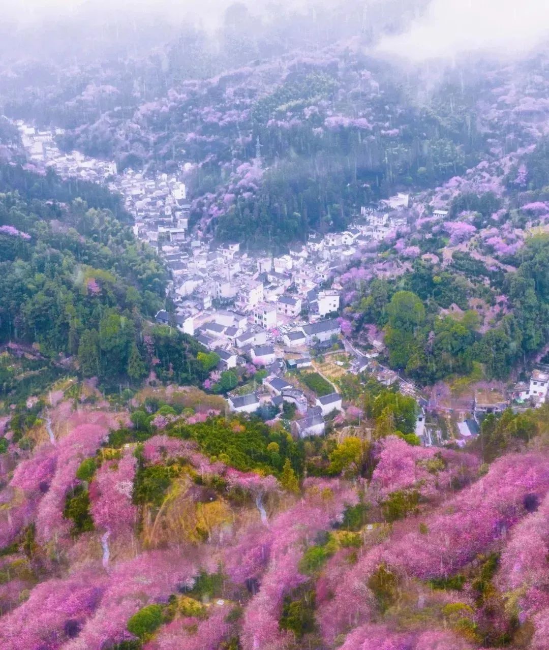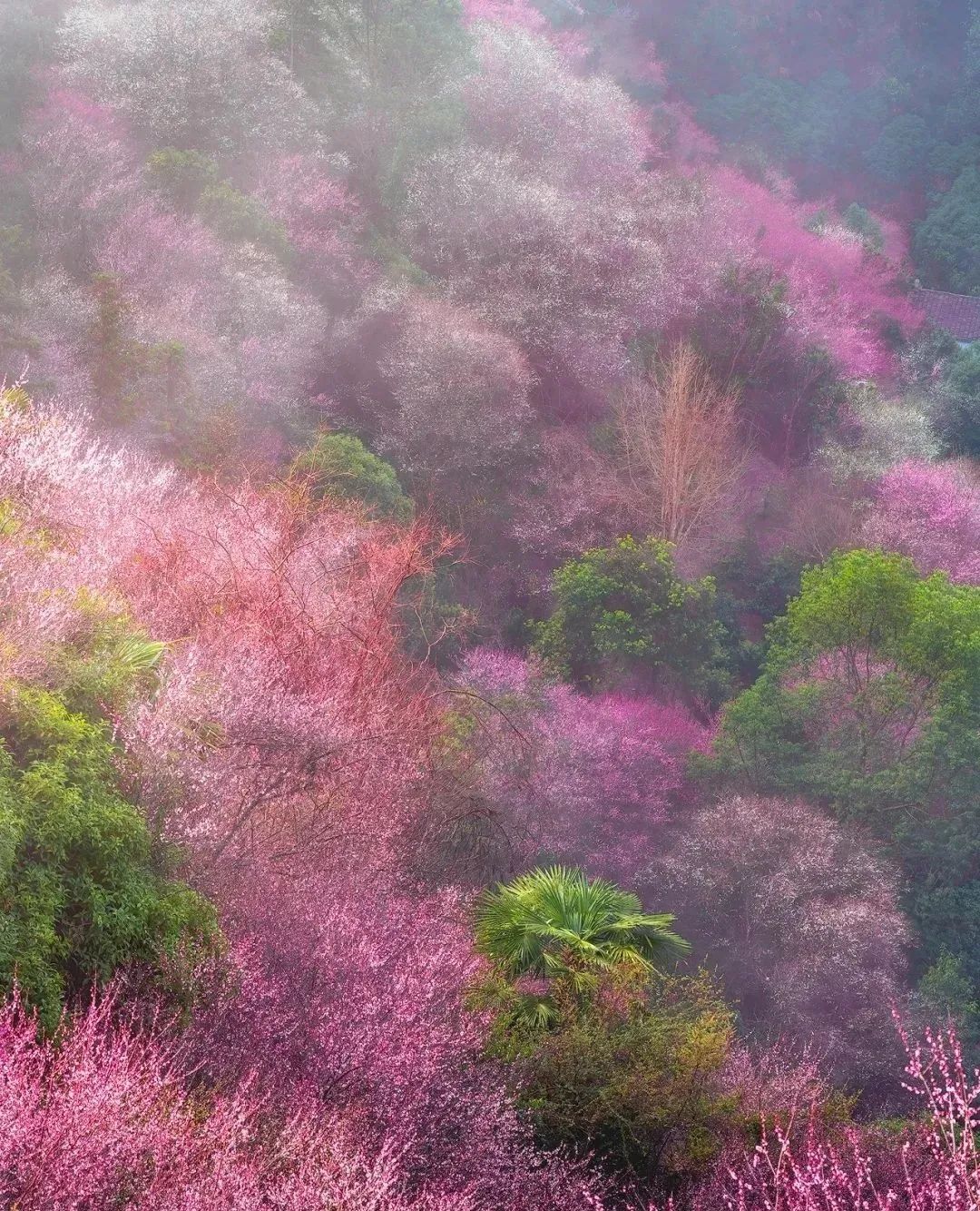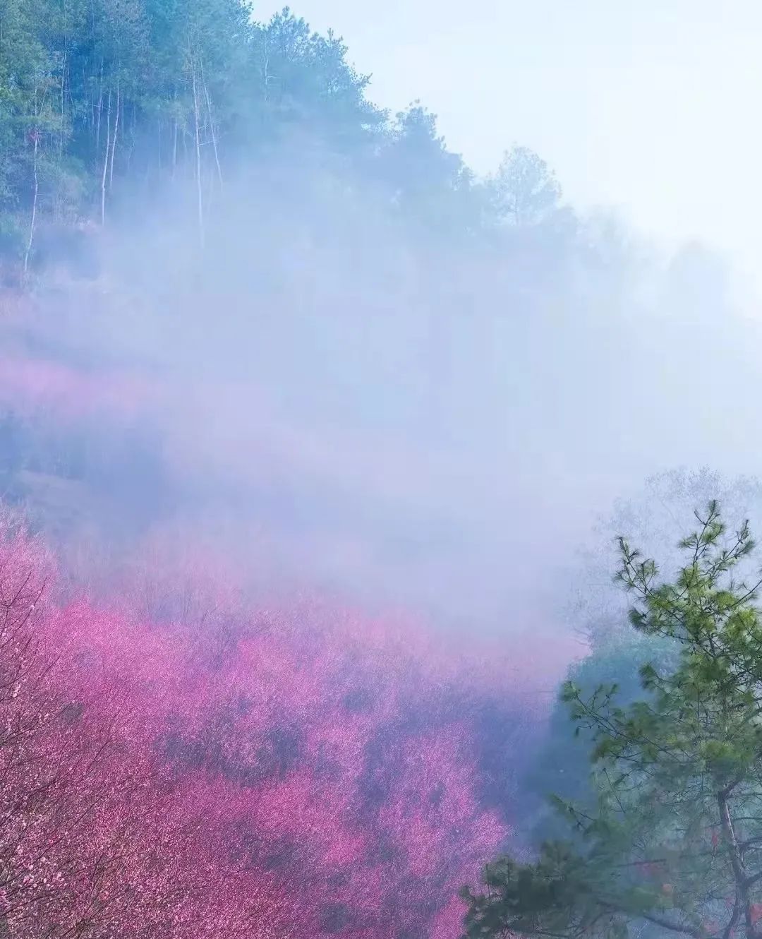 每到初春,鱼形状的深山坳就会开满梅花,有的似晚霞烟云,有的如烟花灿烂,落英缤纷,梦幻得不像话。