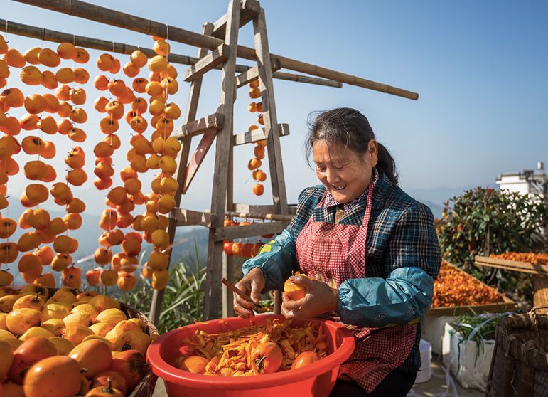这里除了大片的云海和梯田式种植的贡菊,更吸引人的是秋天丰收时节,家家户户的门前都晾晒着柿砣。
