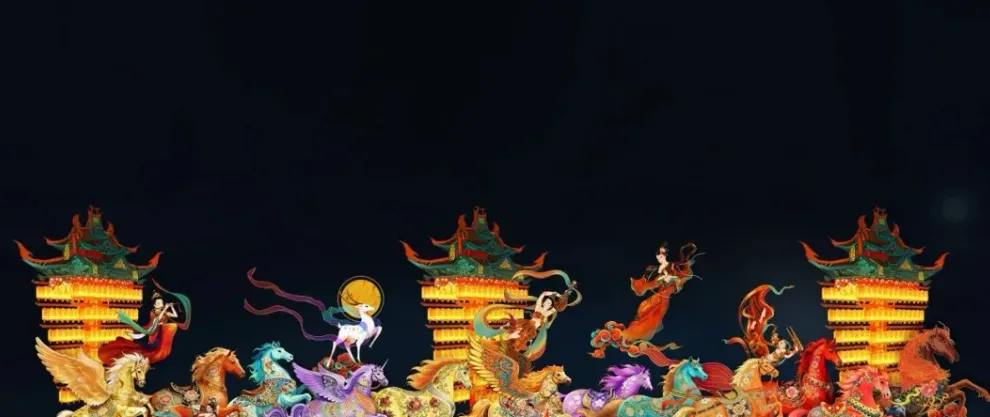 “大河颂歌主题区”则着力展现黄河文化的雄浑壮丽。灯组以奔腾的骏马群像隐喻黄河之水天上来,气势恢宏;马群之上,敦煌飞天形象翩然起舞,衣带当风,生动演绎着黄河千年文明的流淌与传承。
