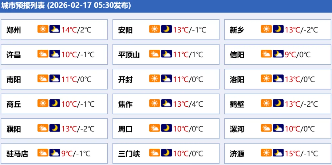 ⭐2月16日,据河南气象消息,随着冷空气的谢幕,河南大部也将在阳光明媚、晴朗和煦的天气中进入丙午马年。从初一到初五基本都是阳光打底,多云或者大晴天,气温也将开启“大回暖”模式。详情>>