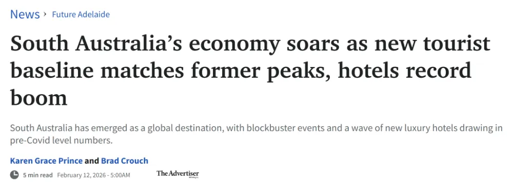 今天是2月17日星期二 阿德莱德天气:晴 气温:14-28摄氏度 澳元兑换人民币汇率:1:4.89 1.南澳旅游复苏带动经济强劲增长 2.North Terrace拟建4亿澳元学生公寓塔楼 3.南澳乡镇地区成为新移民安家首选 4.Salisbury拟建新板式网球中心 5.Casey Treloar出任七号台天气主播 最新数据显示,南澳经济正因旅游业全面复苏而实现显著增长。游客数量已回到疫情前高峰水平,酒店入住率和旅游支出均创下新纪录。