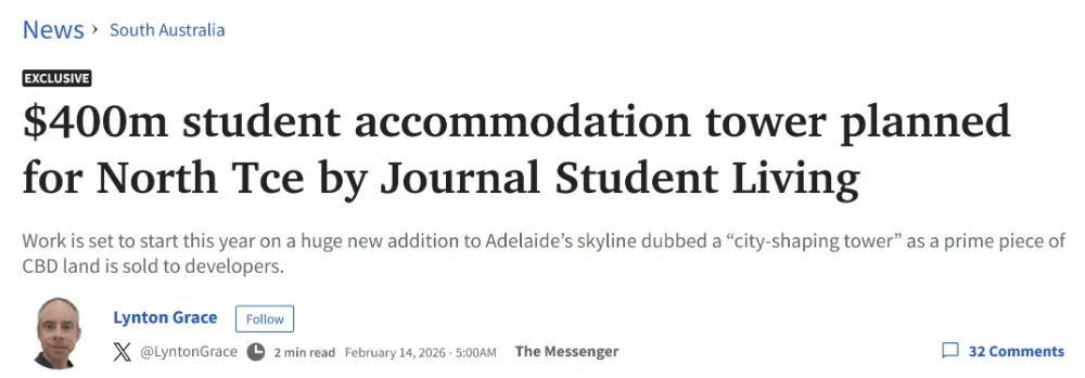 经济学家指出,旅游业回暖对就业和税收贡献显著,是当前经济增长的重要驱动力之一。 总部位于英国的学生公寓开发商Journal Student Living计划在阿德莱德市中心North Terrace建设一座价值约4亿澳元的高层学生住宿塔楼,为市区带来数百个新增床位。