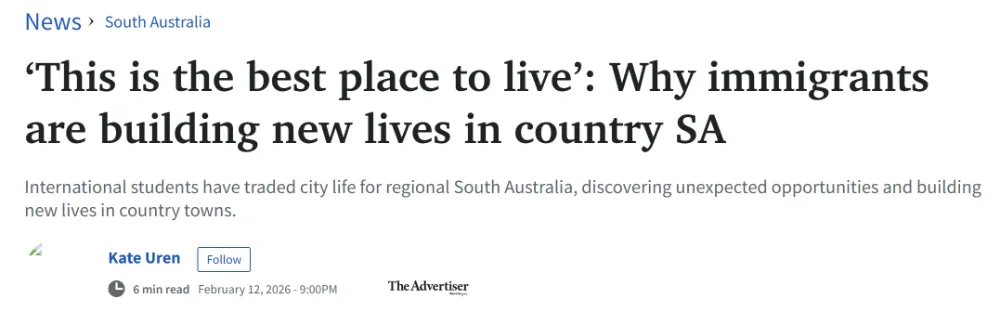 开发方表示,随着国际学生数量恢复并增长,阿德莱德市区对高品质学生住宿的需求持续上升,尤其是在教育机构集中的North Terrace一带。 越来越多新移民选择在南澳偏远及乡镇地区定居,而非传统的大城市中心。政府数据显示,地区城市因生活成本较低、就业机会增加以及社区氛围更紧密,正成为移民安家首选。