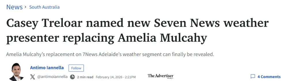 然而,部分观察人士认为,市场竞争可能趋于饱和,需谨慎评估商业可行性。议会方面表示,将通过市场调研确保项目具备长期运营能力。 南澳电视媒体迎来人事变动,Casey Treloar被任命为Seven News阿德莱德版的新任天气主播,接替长期担任该职位的Amelia Mulcahy。