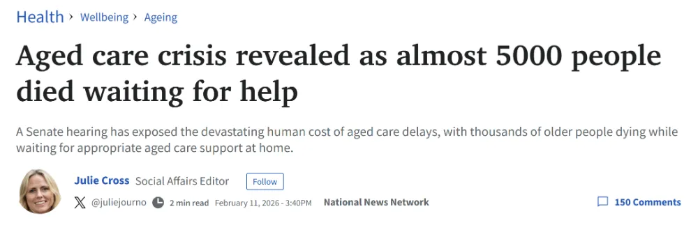 前任天气主播Mulcahy在任期间积累了大量观众基础,其离任引发不少观众关注。电视台方面感谢她多年来对节目的贡献,并祝愿其未来事业顺利。 澳大利亚养老护理体系面临严峻挑战。最新数据显示,约5000人在等待获得居家或机构养老服务期间去世,引发社会广泛关注。