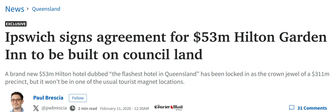 据当地议会称,一家耗资 5300 万澳元的希尔顿品牌酒店即将落户伊普斯维奇,这将极大地促进该市的旅游业发展。令人惊讶的是,伊普斯维奇的游客数量已经超过了努沙。 希尔顿花园酒店将坐落于Ellenborough St一块空置的市政用地上,毗邻Nicholas Street Precinct,酒店将拥有七层楼,共160间客房。 编译声明: 本文为本公众号编译和整理自英文来源,仅代表原作者或原平台态度与观点,不代表我方态度与观点,文章或有适当删减。未获我方授权严禁转载,在获授权前提下,转载必须在醒目位置注明文章出处与文章链接。对未注明而擅自转载者,我方保留追究法律责任的权利。 版权声明: 本微信公众号所有原创作品,其版权属于本微信公众号所有。其他媒体、网站或个人未经允许不得进行原版原式的转载,也不得歪曲和篡改本微信公众号/app所发布的内容。如有侵权,请联系删除info@yiben.com.au