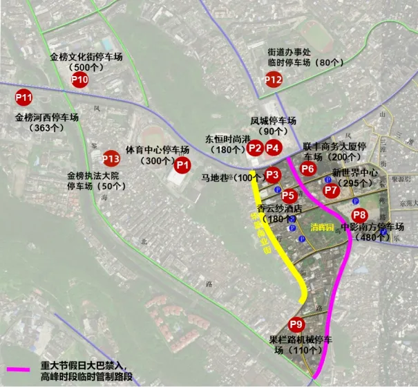 2、金榜牛乳街附近开放金榜文化街停车场及金榜河西停车场,建议停放至停车场再步行至牛乳街。