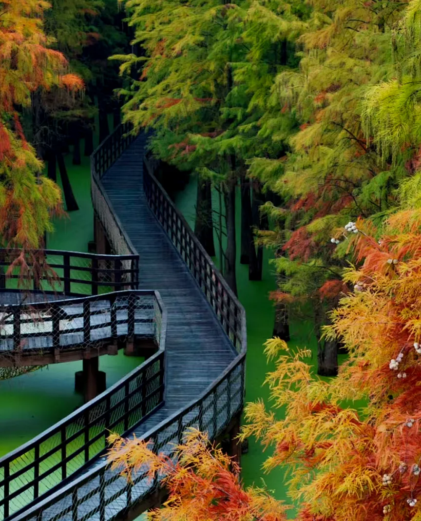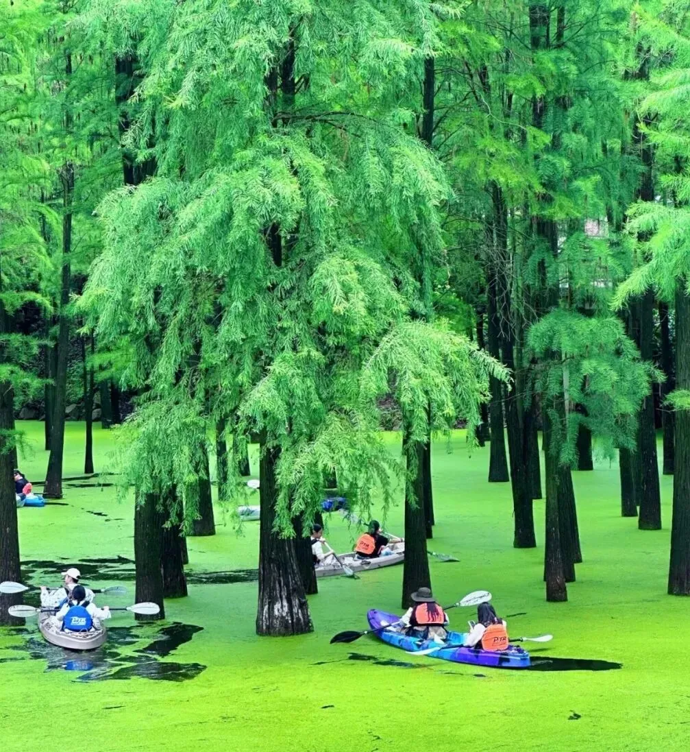 10000多棵池杉与落羽杉挺立于碧波之上,枝叶交织成浓密的绿伞,将暑气隔绝在外。乘一叶扁舟穿行其间,恍若闯入绿野仙踪。水上运动中心的摩托艇、尾波冲浪等项目能让你在湖面挥洒汗水,湖风裹挟着水汽扑面而来,瞬间吹散所有燥热。