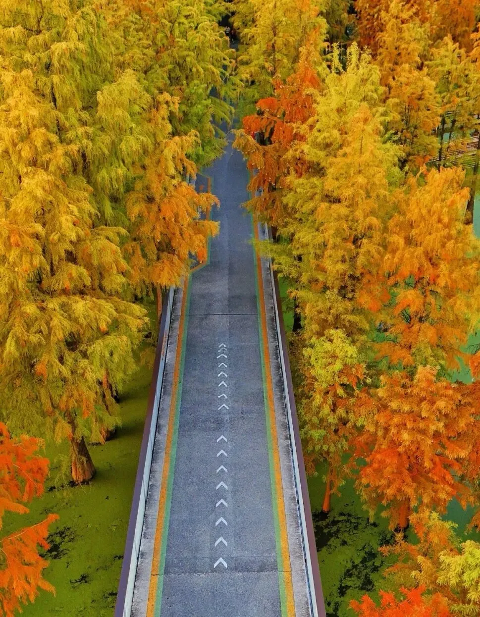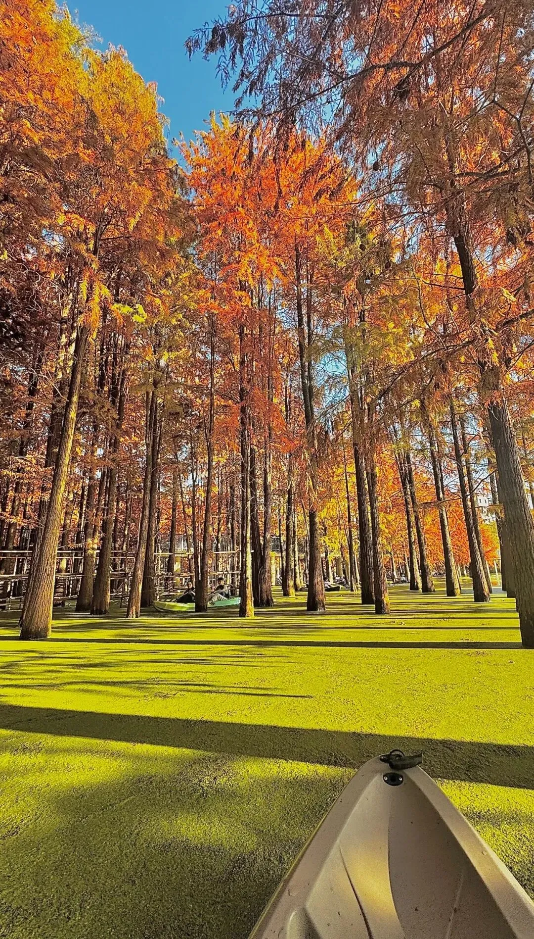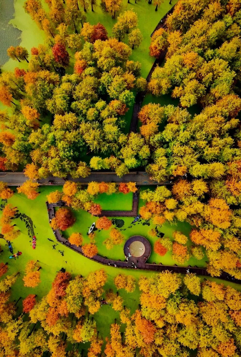 的青山湖是大自然的调色盘。水上森林换上橙红与金黄的盛装,三色渐变的枝叶倒映在抹茶蛋糕般的水中,如一幅流动的油画。摄影爱好者定格光影,每一处都是自带电影感的画面。