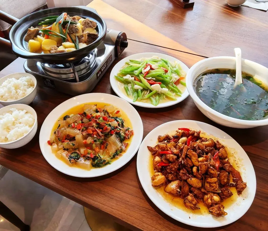 火腿笋干织汁果、农家小炒鸡、天目小土豆排骨暖锅、西芹百合(时令蔬菜季节性更换)、 一品荠菜海鲜羹、 米饭/春风满面菠菜面;