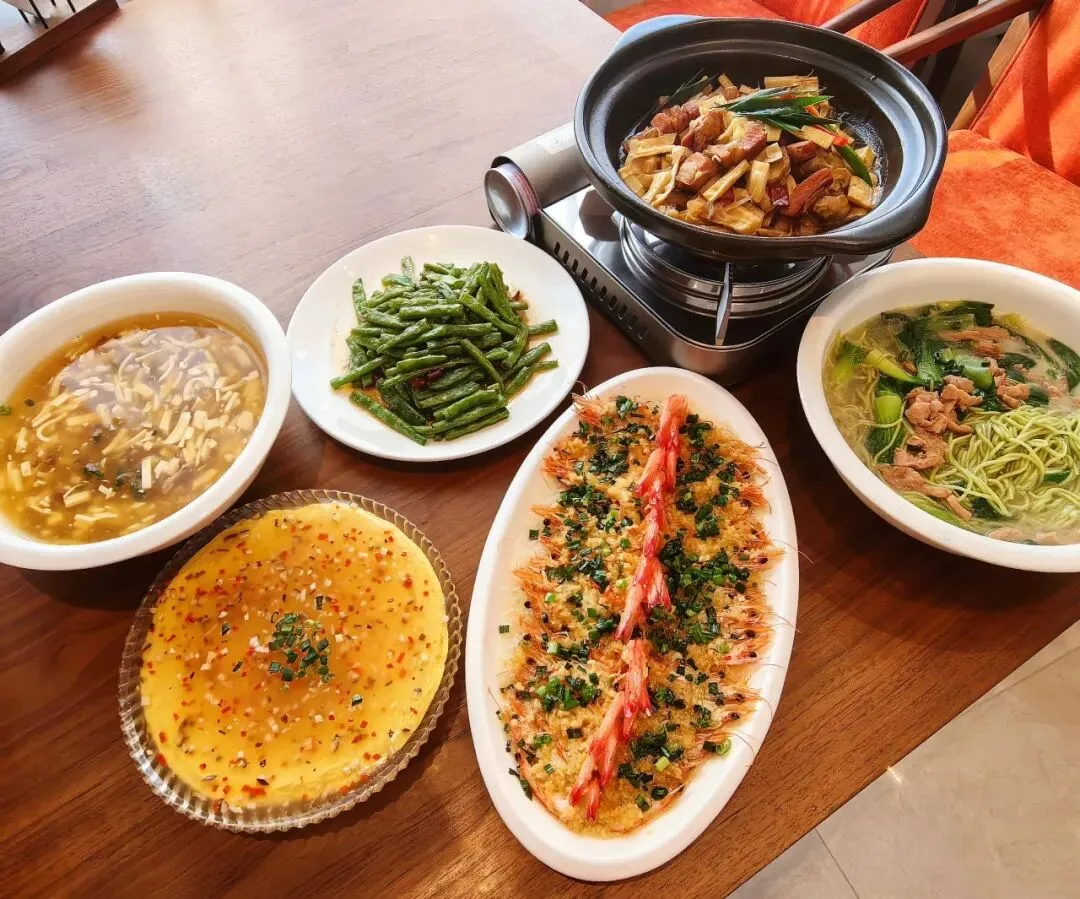 芙蓉土鸡蛋、开片蒜蓉虾、天目笋干咸肉暖锅、干煸四季豆(时令蔬菜季节性更换)、 西湖牛肉羹 、米饭/春风满面菠菜面;