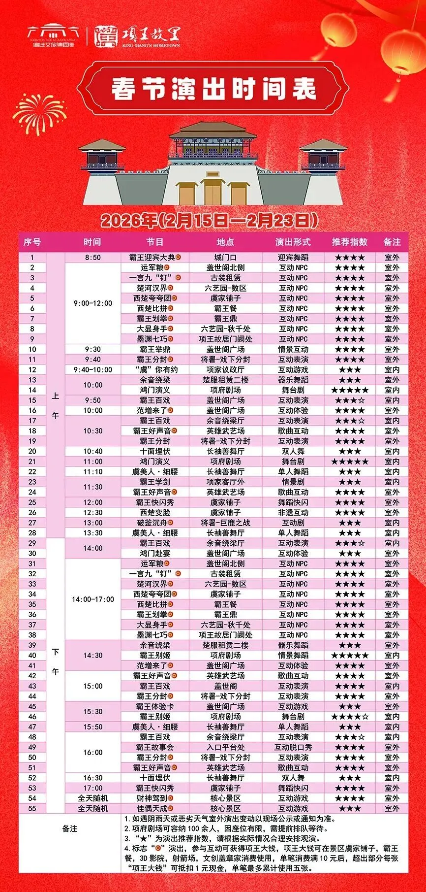 《霸王别姬》《霸王夸夸团》《鸿门演义》《西楚变脸》等50余场西楚特色演艺每天轮番上演