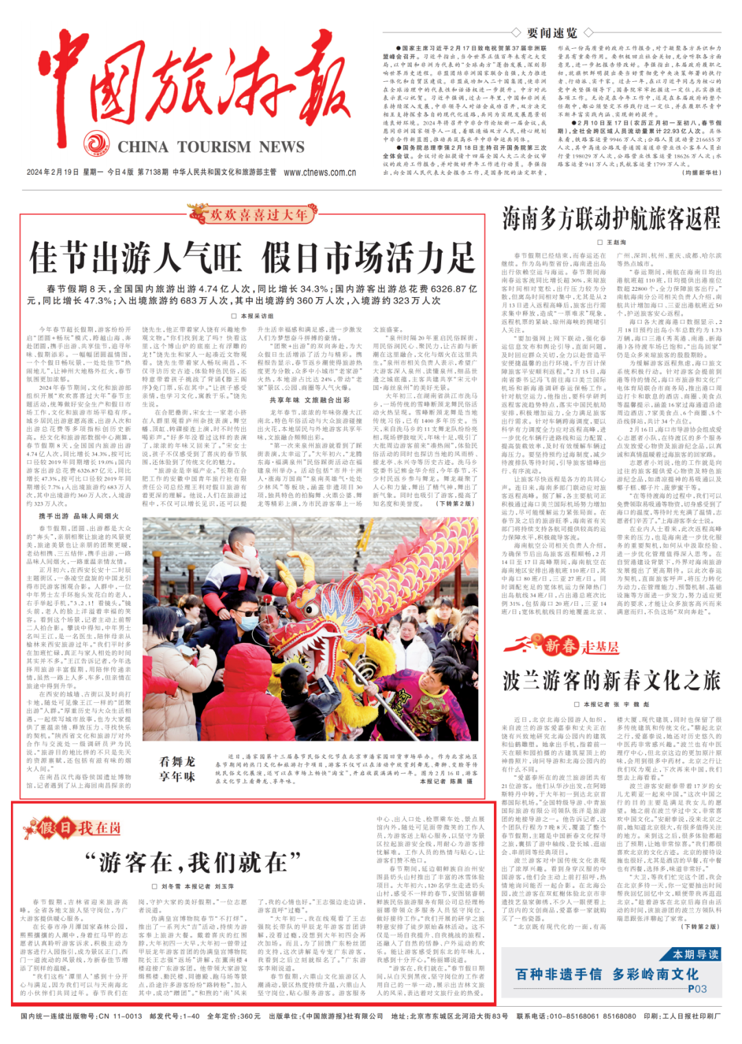 春节假期,吉林省迎来旅游高峰。全省各地文旅人坚守岗位,为广大游客提供暖心服务。