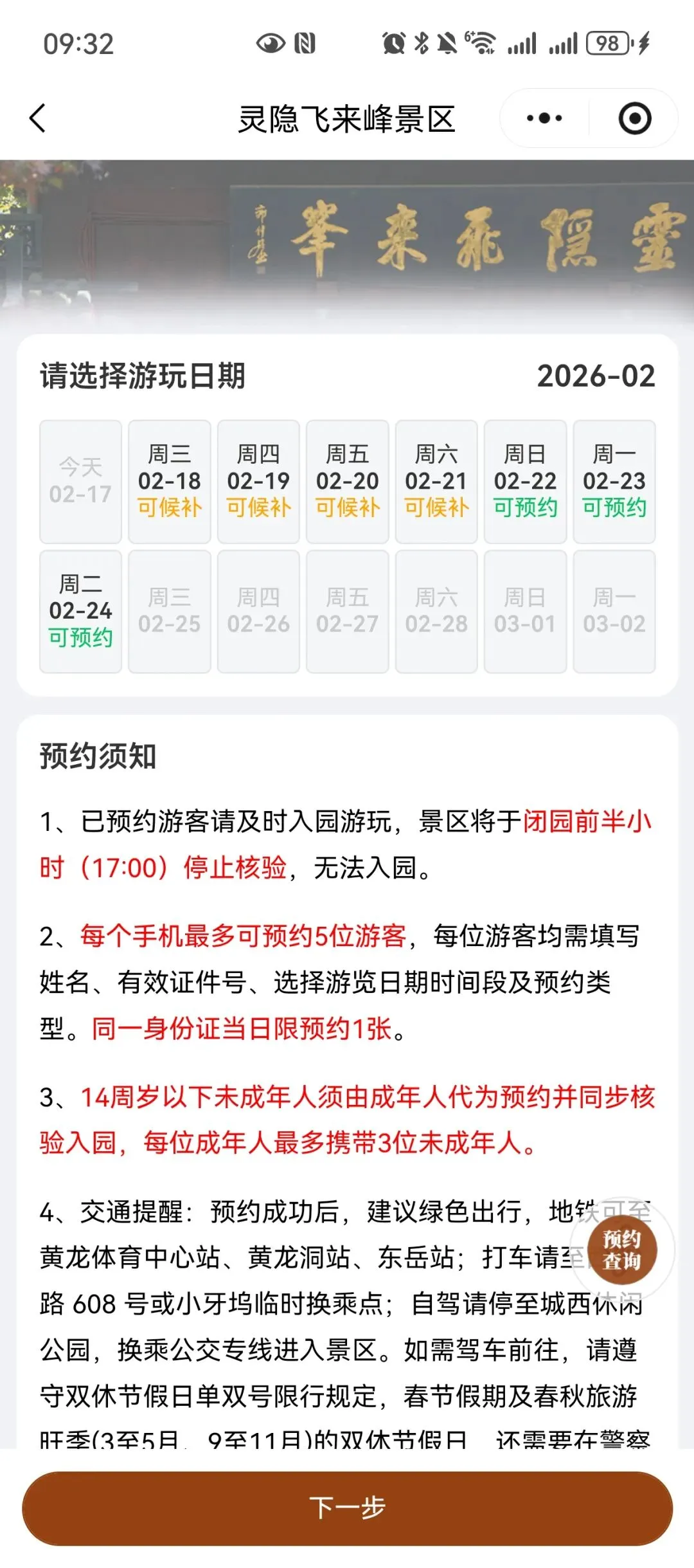 提醒:当前杭州灵隐飞来峰小程序显示:初二到初五只能候补,初六到初七可预约。(每日8点开始)