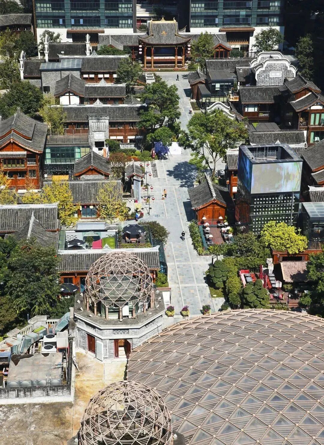 步入这片钢铁森林中的“艺术琥珀”,仿佛走进一个奇妙的平行世界。青石地砖延伸向开放式古典庭院,中式的飞檐与西式的装潢和谐共处。一侧戏台上川剧锣鼓正酣,另一侧玫瑰艺术厅里交响乐已婉转流淌。泰式餐厅、日式料理、韩式服务……多国的文化元素在这里融合交汇。
