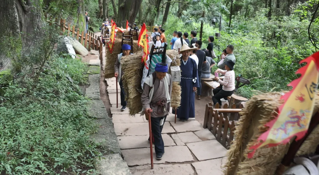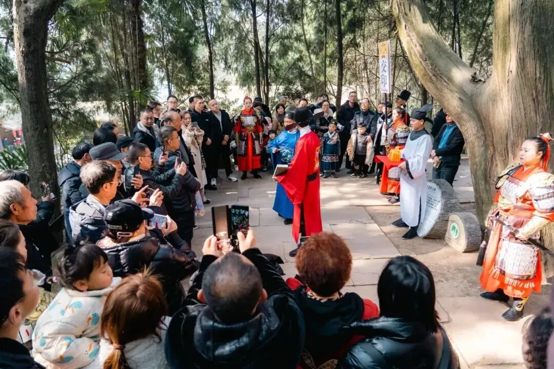 新春的翠云廊,千年古柏缀满喜气,沉浸式情景剧如期上演。演员们身着古装,在苍劲古柏间演绎经典片段,复刻岁月韵味,每一幕都极具代入感。漫步古柏道,听林间演绎声、赏新春好景致,在清幽绿意中感受传统文化的魅力,沉浸式解锁古蜀道的新春古韵与独特文化底蕴。