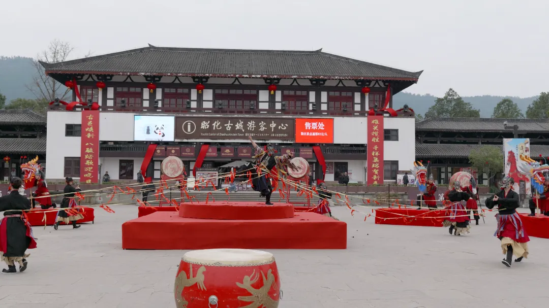 千年葭萌,喜乐闹春!昭化古城初一活动精彩纷呈,击鼓互动邀你敲响新春福气,情景舞蹈《雄峻踏福图》舞姿曼妙,开启新春好彩头。