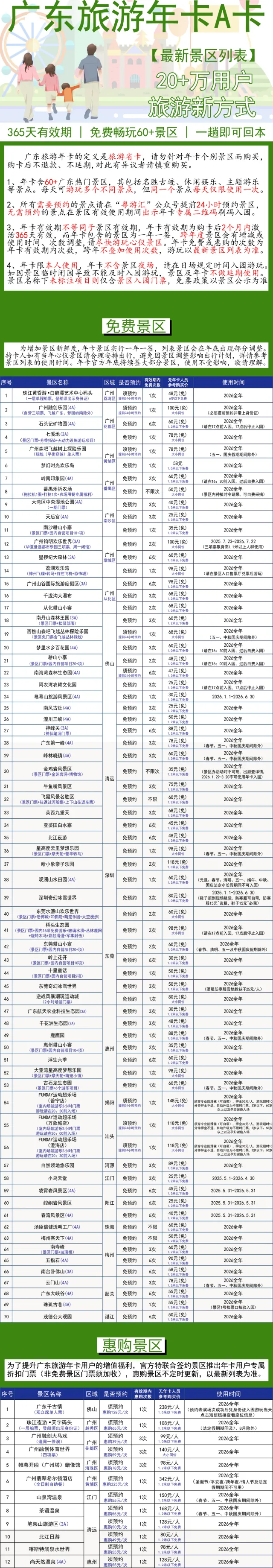2、大部分的景区全年均可不预约即可使用,个别景区有使用时间、次数限制、须预约,出游前请查看“粤游汇”微信公众号最新年卡公告;年卡内包含的大部分景区1.2米(不含)以下儿童免票,详见景区列表说明,年龄太小的孩子请自行考虑是否购买。