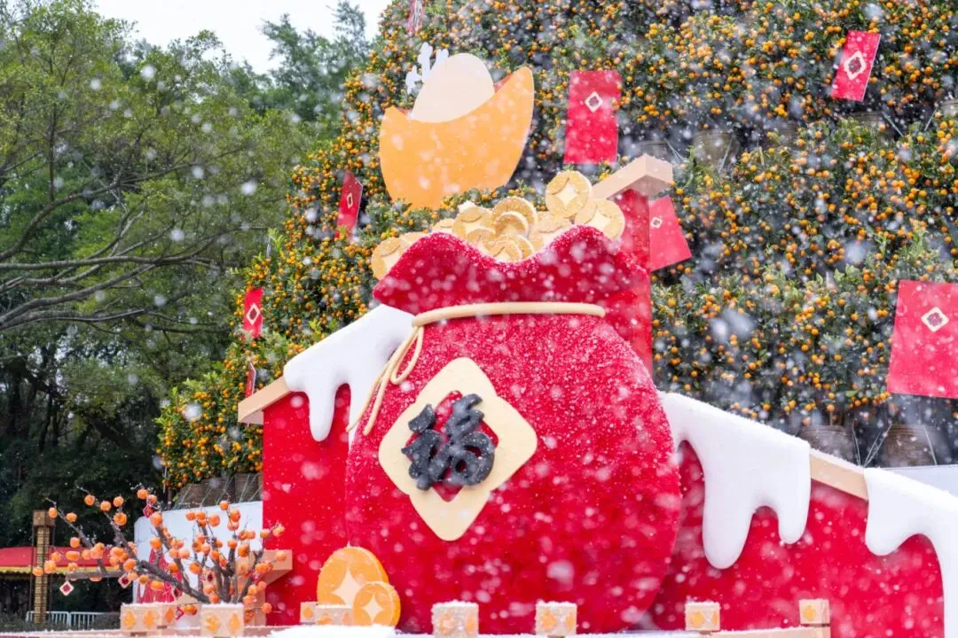 山上特色打卡点云集:天湖广场16.88米五福桔塔寓意吉祥,双子亭火山口飘雪走廊浪漫唯美;索道上站“雪诏・启程”打造岭南雪国,桃花园“雪兆春鸿”桃花映雪,鸿运大道年味十足。南门、北门、西门三大入口各具风格,沉浸式拍照、动感互动、福气满满,随手拍出大片。