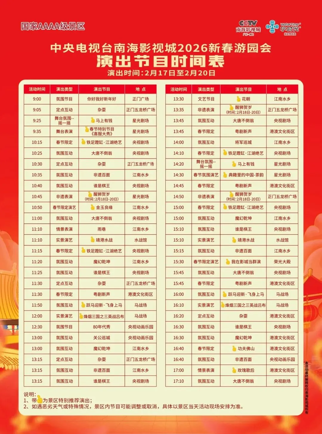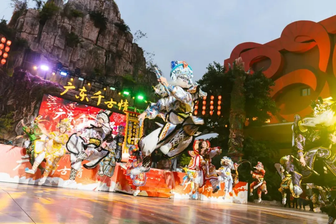 2月18日至21日,温兆伦、江华等港星将带来“明星盲盒”互动,引发回忆杀。核心演出《广东千古情》以高科技演绎大湾区6000年历史,景区内多条特色街道实现“全园有戏”。