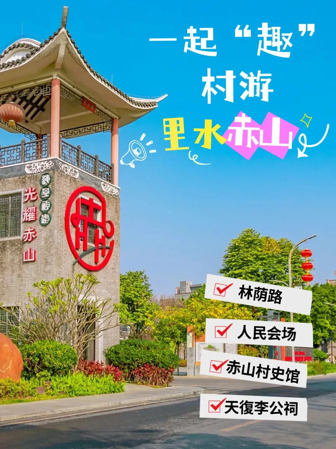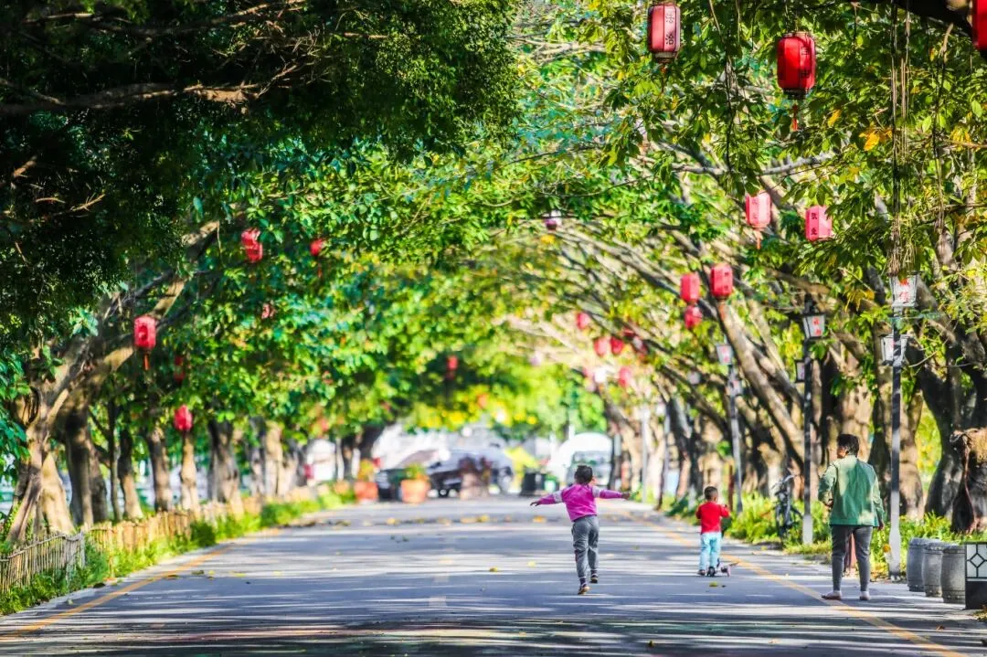 走入赤山村近两百米长的林荫道,阳光透过成行的大树撒到地面上泛出金色的光芒,古典的灯笼在微风推动下轻轻晃动,这里绿树成荫,简直就是一个“天然氧吧”。