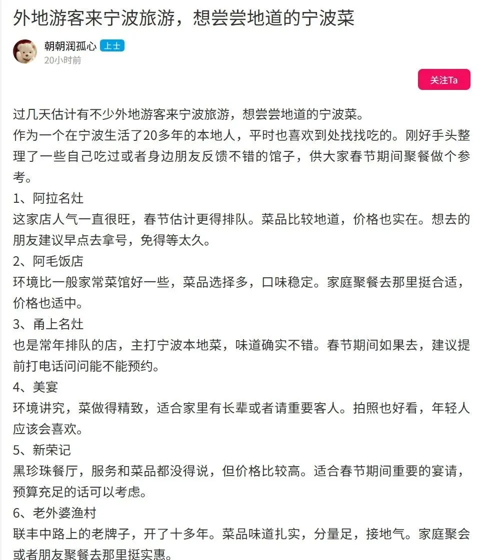 昨日,有网友在东论上发帖求助,说朋友初四来宁波旅游,给他发来一份很多博主推荐的宁波网红菜馆清单,让他帮忙点评点评。他打开一看,好家伙,全是小某书上博主们反复推荐的那几家网红餐厅,名头不是必吃榜就是排队王。