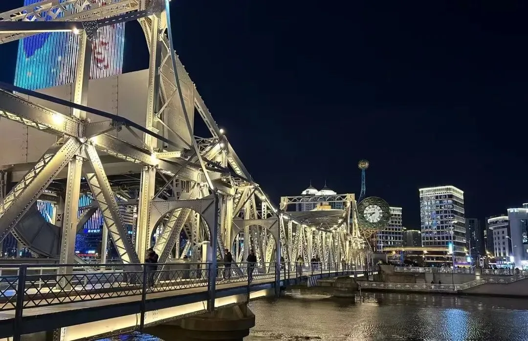 步行过解放桥,这座可开启的钢铁大桥,夜晚灯光勾勒出硬朗线条,整点灯光秀氛围感拉满。沿河岸前行,北安桥鎏金雕塑与欧式栏杆华丽大气,随手一拍都是欧式大片。转入意式风情区,马可波罗广场喷泉、地中海风格建筑灯火摇曳,街头小店飘出咖啡香,漫步其间,仿佛置身欧洲小镇。
