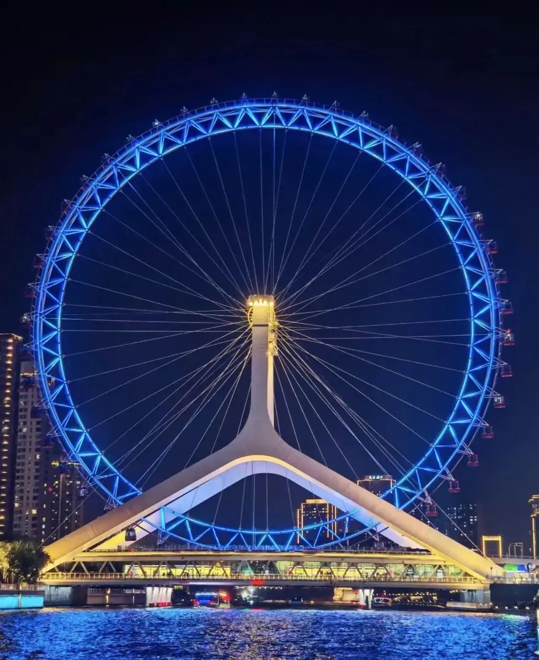 继续向北,狮子林桥上百尊石狮栩栩如生,继续前行约300米到达金刚桥,金钢桥是拍摄天津之眼的最佳点位。作为世界唯一桥上摩天轮,天津之眼夜幕下如巨型红宝石,缓缓升至高空,可360°俯瞰海河蜿蜒、万家灯火,浪漫值拉满。