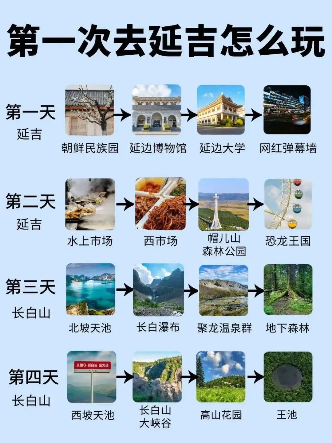 D1:延边.博物.馆 → 人民.公园 →. 延吉大.学网红.墙 → 全州.拌饭