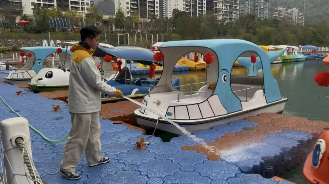 作为罗甸新春康养游玩的好去处,度假区内各核心区域已全面整装完毕。月亮湾码头的游船被细致清洁,红灯笼点缀船身,泛舟玉湖,可尽览山水相依的新春盛景;玉湖大桥下的游乐区,蹦床、休闲设施逐一检修擦拭,安全防护全面到位,是亲子撒欢的欢乐天地。