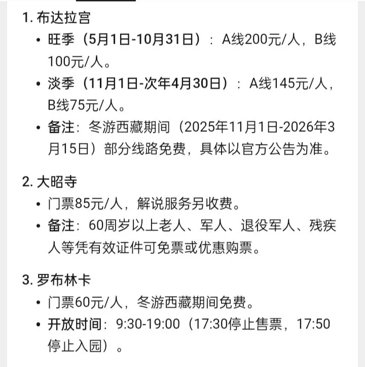 注意,以上旅游景点价格都是旺季价格,有些地方冬天淡季就不要门票了。问题是,冬天太冷,即使不要门票,也不能去,代表就是西藏。
