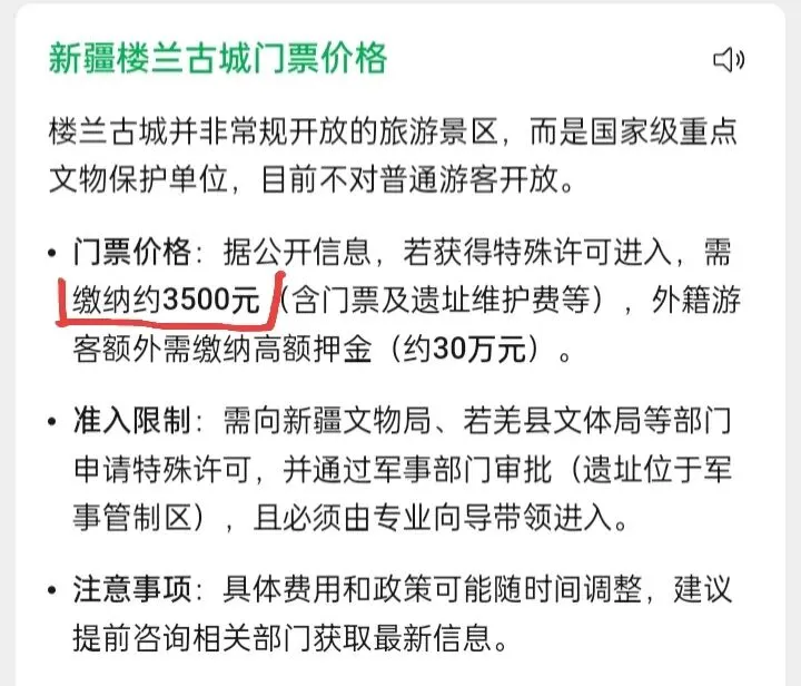 看看上面的交通费用,你还能说便宜吗?虽然门票终生有效,但路途遥远,又有几个人愿意再去多次呢?除了甘孜州之外,其它全国各地的门票也不便宜。虽然国家严格控制旅游景点门票乱涨价,但上有政策,下有对策,就是靠景区的交通费用赚钱。 现在很多旅游景点卖门票的地方,距离景点都很远,如果你自己开的车,是不允许进景区的,必须坐景区的观光车。这样以来,有的旅游景点,观光车费用和索道缆车费用,加在一起,比门票还贵。像广西涠洲岛,虽然上岛的门票不是很贵,但开往海岛的轮船票特别贵。 关于国内旅游景点门票价格,有的人认为太贵,也有人认为能接受。反对门票贵的人认为,中国普通百姓每个月的工资收入基本上只有五千元人民币,日韩欧美发达国家普通百姓的月工资收入接近三万元人民币,但中国旅游景点门票价格居然超过了日韩欧美,这样很不合理。也有人认为,中国人口太多,不能和外国比。外国基本上只有文物古迹才卖门票,很多山水自然风光都是免费。假如中国也学外国,会导致山水美景被毁灭的,必定中国人口早就超过了十四亿。 不得不说,中国旅游景点门票太贵确实是事实,但中国人口太多也确实是事实。其中,新疆楼兰古城的门票,国内游客是3500元人民币,国外游客是30万元人民币,据说是全世界收费最贵的旅游区了,而且还不是正式开放,还要提前申请,还要办很麻烦的手续才行呢。 另外,中国目前依然还有很多地方大海要买门票,包括海滩、海岸。例如北部的辽宁省大连市金石滩;东部的浙江省舟山市部分海岛的沙滩,南部广东省深圳市有三个地方的海滩都要买门票,分别是东涌海滩、西涌海滩、玫瑰海岸。下面是国内部分景点门票价格。 1,云南省西双版纳