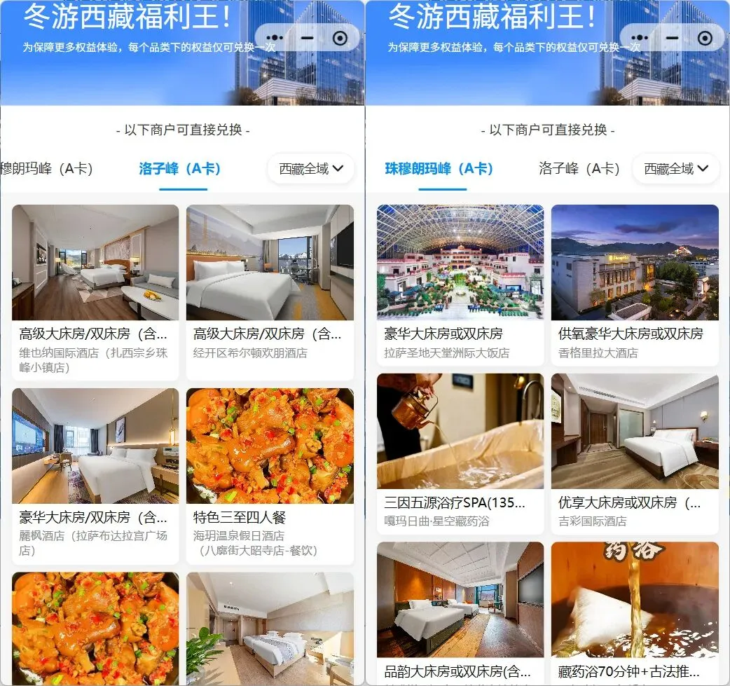 比如洛子峰A可选权益有:维也纳国际酒店/希尔顿欢朋/麓枫,以及3-4人餐…… 珠峰A可选权益有:拉萨洲际/拉萨香格里拉,以及药浴…… 那么我可以洛子峰A选择一晚维也纳,然后珠峰A选一晚拉萨洲际……以此类推其他权益专区也能选一个权益使用 具体每个权益专区可选的权益在下图