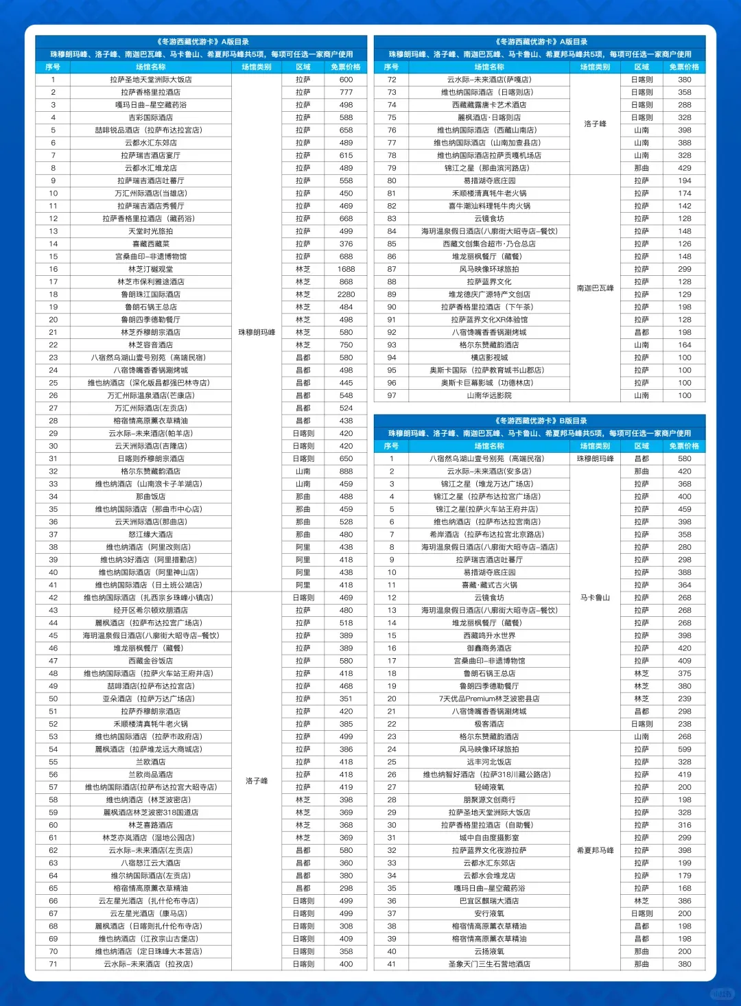 我给大家详细解读一下: 冬游西藏优游卡售价199¥,里面包含6次权益 这6次权益在6个权益专区里,分别叫:珠峰A、洛子峰A、南迦巴瓦峰A、马卡鲁山B、希夏邦马峰B、珠峰B(其中珠峰B仅限2.12-2.19使用) 每个权益专区只能选1项权益使用