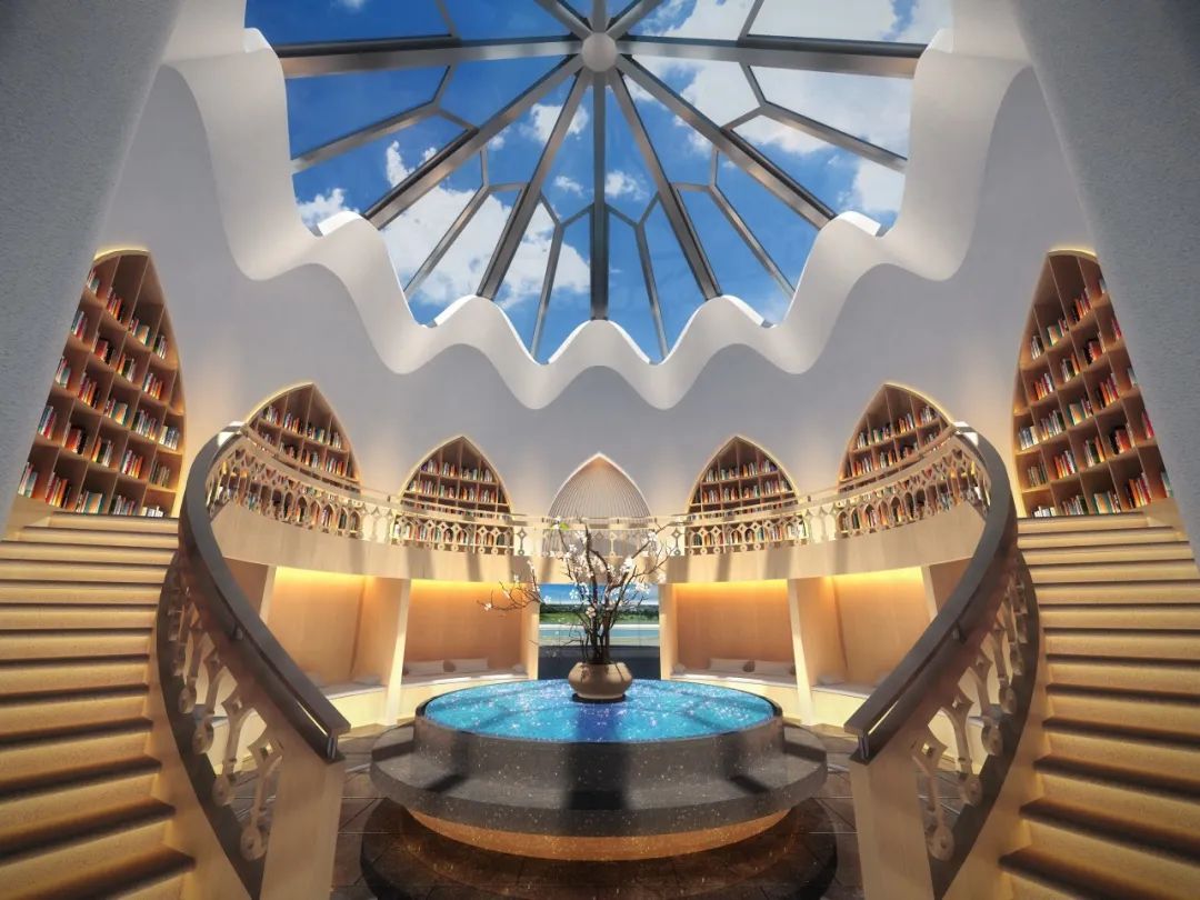The designer extracted the element of Nanning city flower "hibiscus" as the top design of the resort service center, forming a flower bud architectural design form. The resort center covers book bars, swimming pools, hot spring spas, and more. The interior of the building is designed to ensure smooth flow, with a central island shape and heavy columns wrapped around it to support the curved arch with a floor to ceiling glass shape, ensuring the transparency of its spatial structure. The idea of using diamond shaped skylights for lighting at the top of the building adds spatial layers to the interior, creating a spatial texture for landscaping.