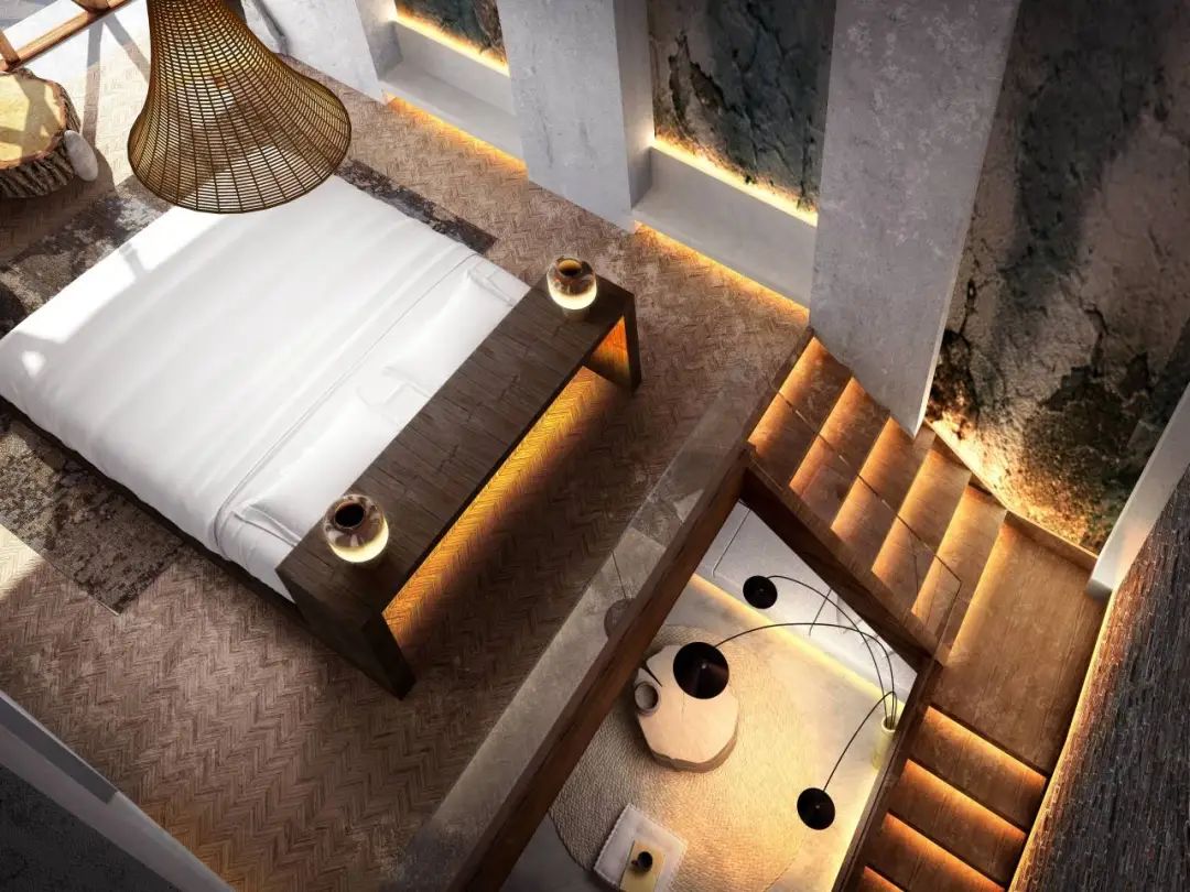 室内以阁楼形式,打造两层空间,满足居住空间的功能需求同时营造一种居室的生活气息。室内利用自然原始石材墙面,并注重人性化的细节感,使空间贯穿设计的精致以舒适,同时用质朴的材料完美诠释惬意的农院生活,采用大开窗为室内引光同时成为最佳观景形式。