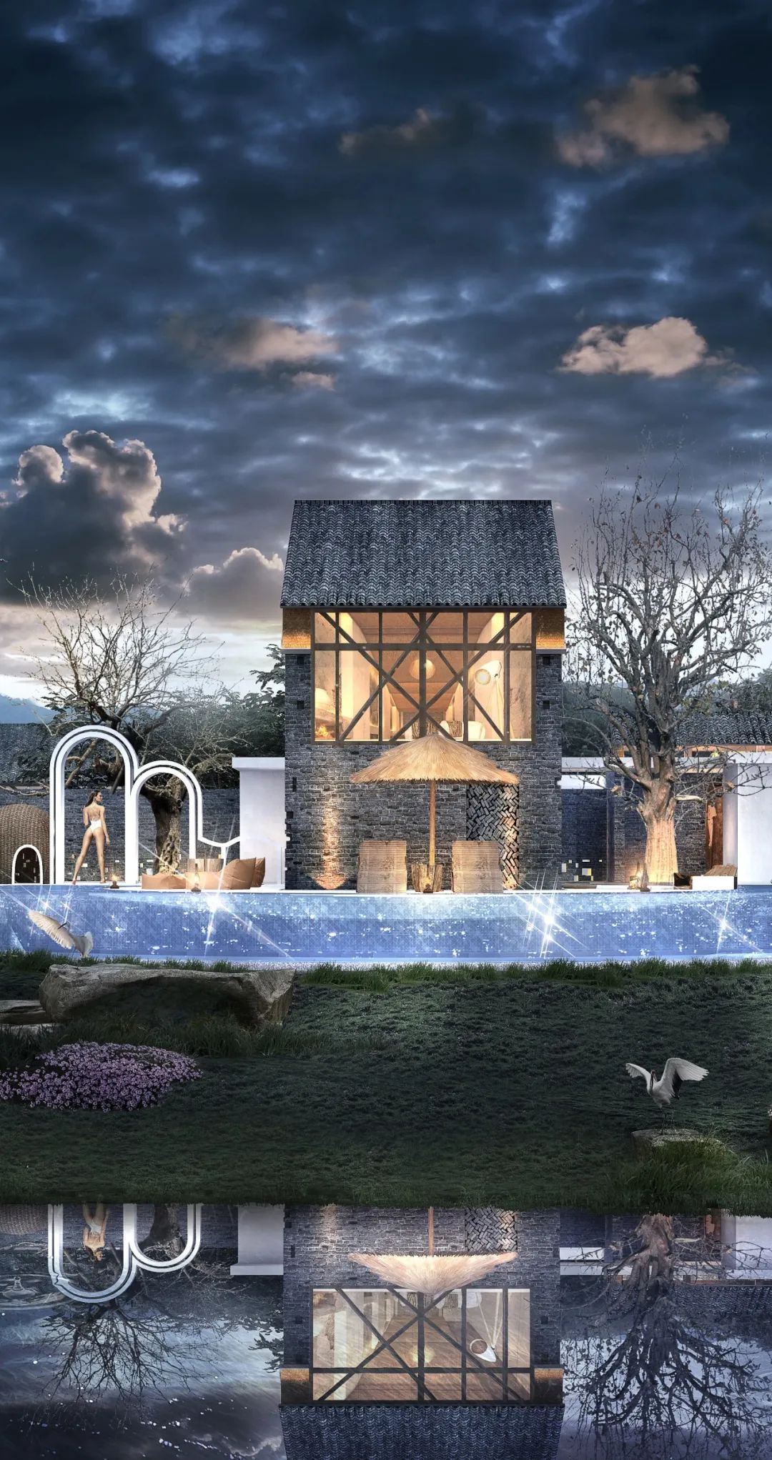 3#院的建筑设计中,设计师保留了原建筑青砖墙体结构,以大窗框的形式对外展示室内空间的温馨与舒适,建筑采用周边地形,在尽可能减少对环境的改变和影响下打造一处舒适浪漫的度假居所。院落周围环绕一个大圆弧景观无边泳池,预留一片休闲娱乐空间增加了更多的互动与惬意氛围。