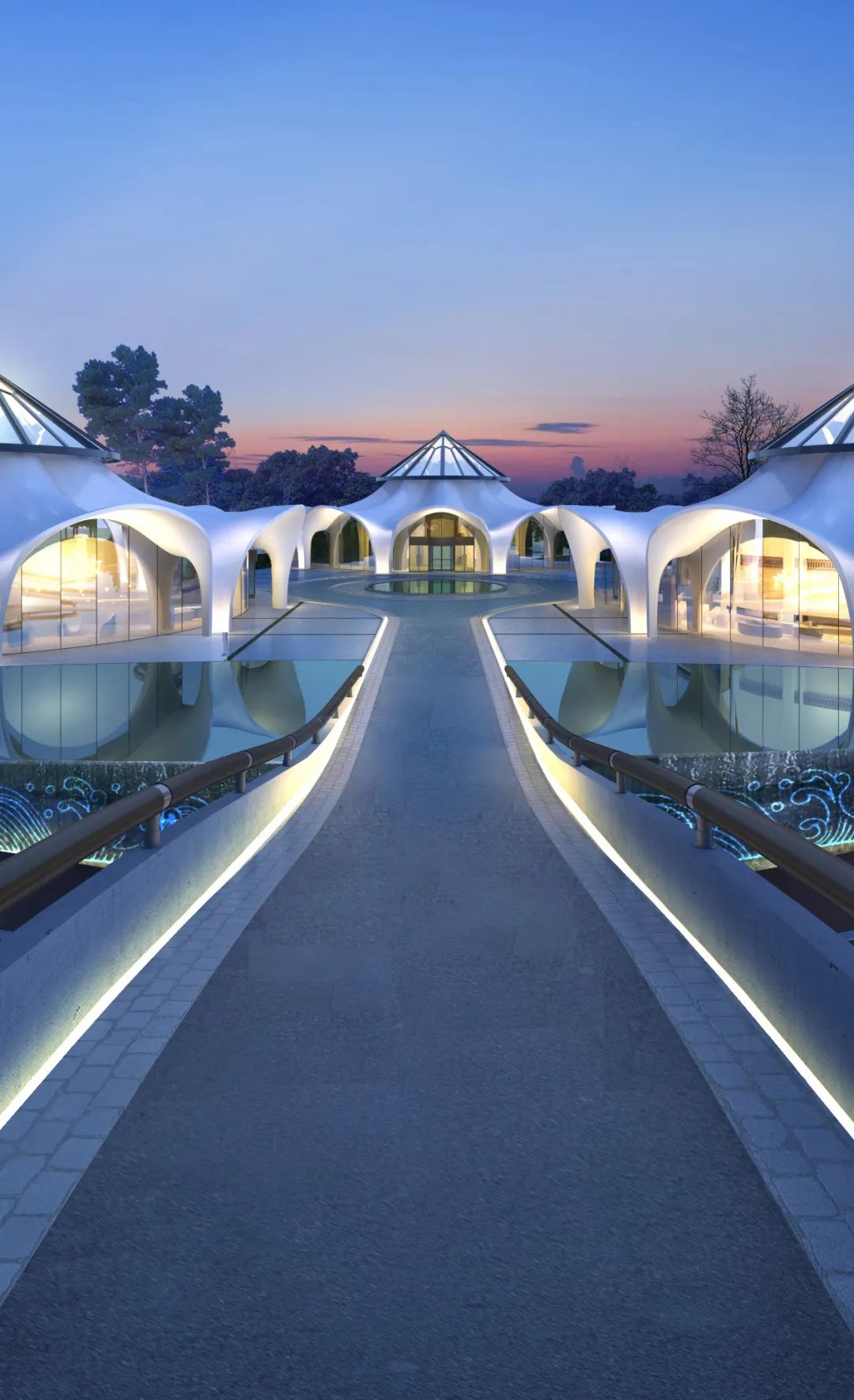 设计师提取南宁市花「朱槿」元素为度假服务中心顶面造型设计,形成花苞的建筑设计形态。度假中心涵盖书吧,泳池,温泉spa 等,建筑内部以保证动线流畅,中岛型设计,四周包裹沉重柱支撑弧形拱门落地玻璃造型,以保证其空间结构的通透性。建筑顶部采用菱形开天窗采光的思路为内部增加空间层此,形成一种造景的空间质感。