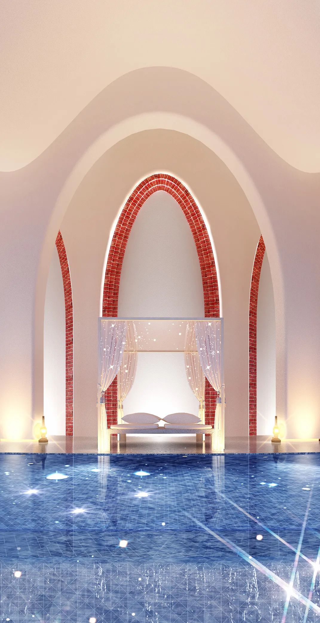 In the architectural design of Courtyard 3, the designer retained the original blue brick wall structure and adopted the surrounding terrain to create a comfortable and romantic vacation residence while minimizing changes and impacts on the environment. The courtyard is surrounded by a large curved landscape with an endless swimming pool, and a leisure and entertainment space is reserved to increase more interaction and pleasant atmosphere.