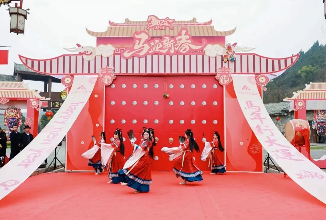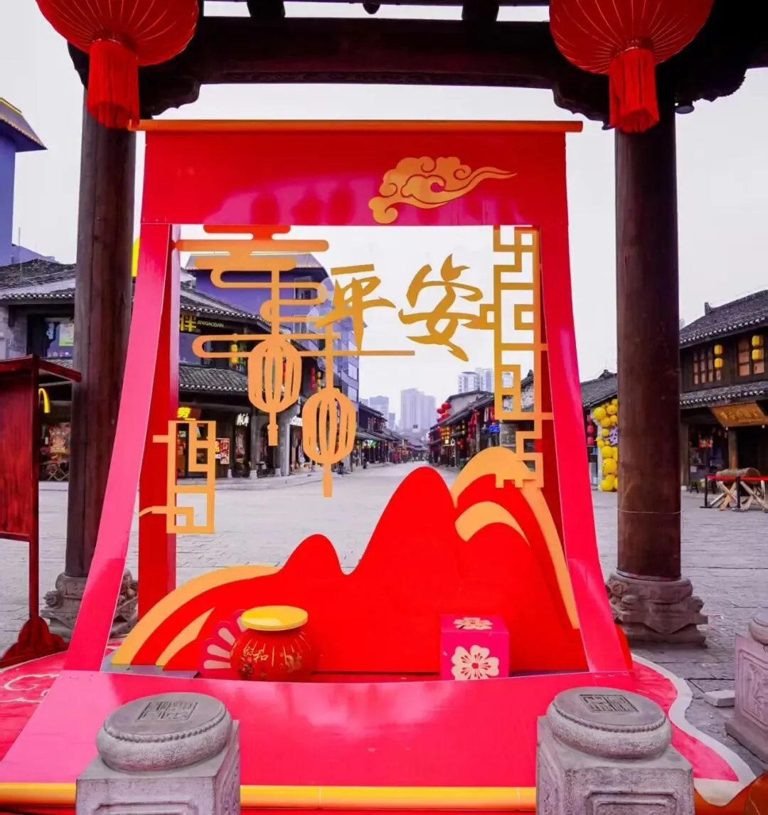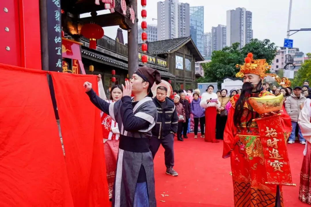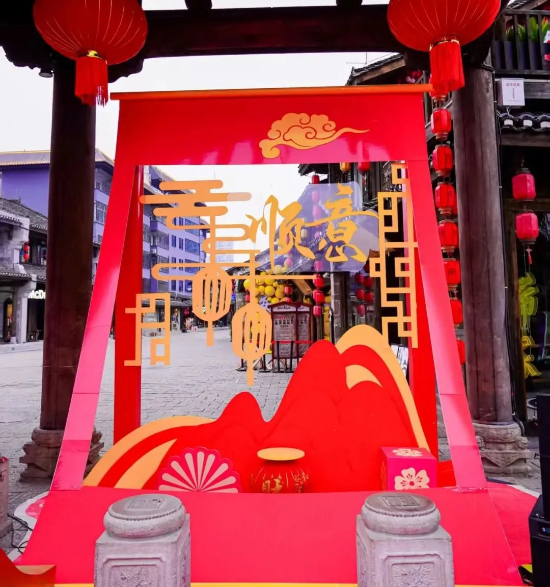 在安顺古城活动现场,以“瀑应鼓鸣・福门洞开”为设计理念精心打造的马年主题财门成为视觉焦点。中国红主色调搭配金色装饰,辅以浅绿点缀,巧妙融合古城元素与金币财宝造型,营造出喜庆祥和的节日氛围。暖场互动环节中,工作人员为到场嘉宾佩戴“头福红围巾”,并向游客派发新年福礼,现场暖意融融、年味十足。