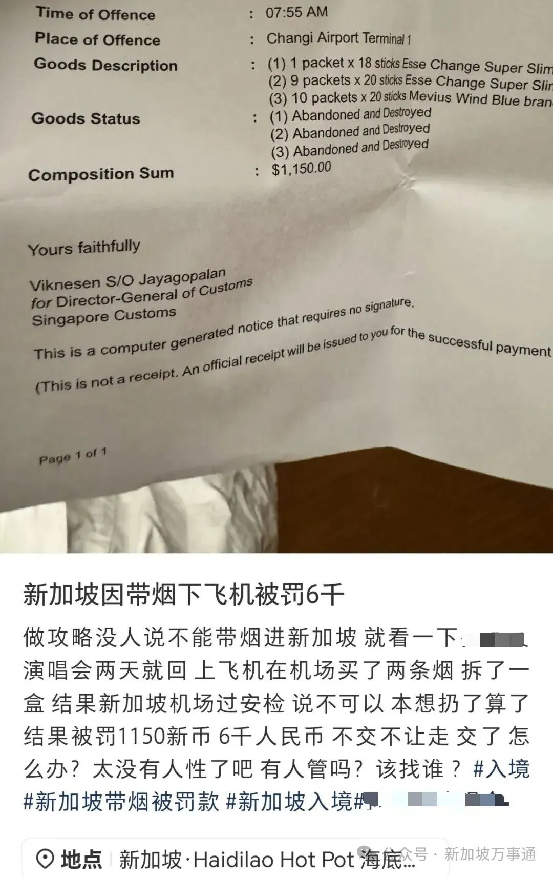 本想着认栽把烟扔了就行,没成想工作人员直接开出罚单——1150新币!换算成人民币快6000块了!