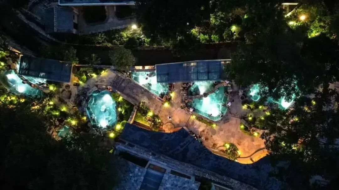 云栖山林 - 秘境温泉 位于康家坪民宿古村内,拥有室内外共14个泡池和3个独立的VIP私汤包间,由一处五孔老窑洞院落改造而成。
