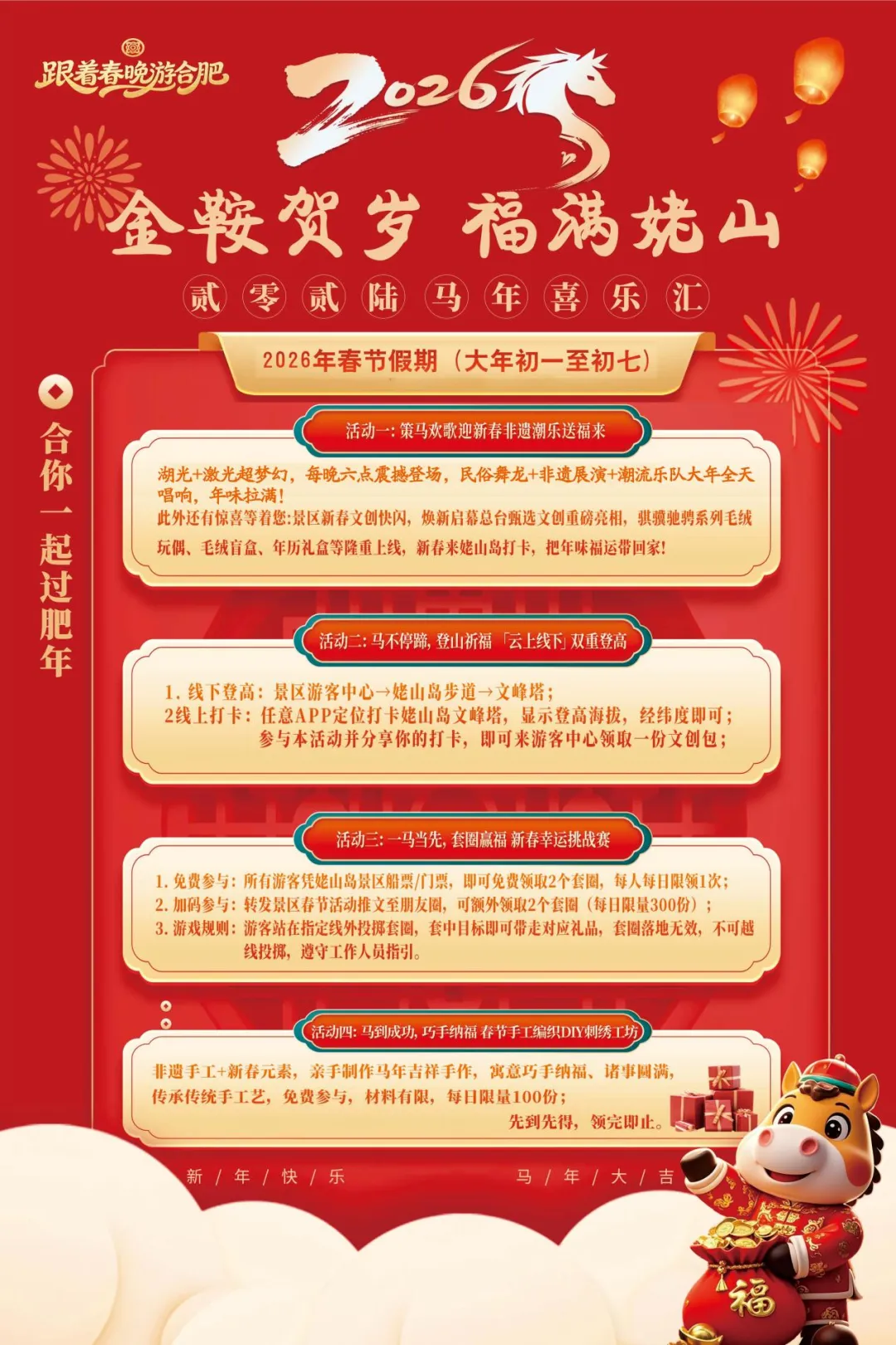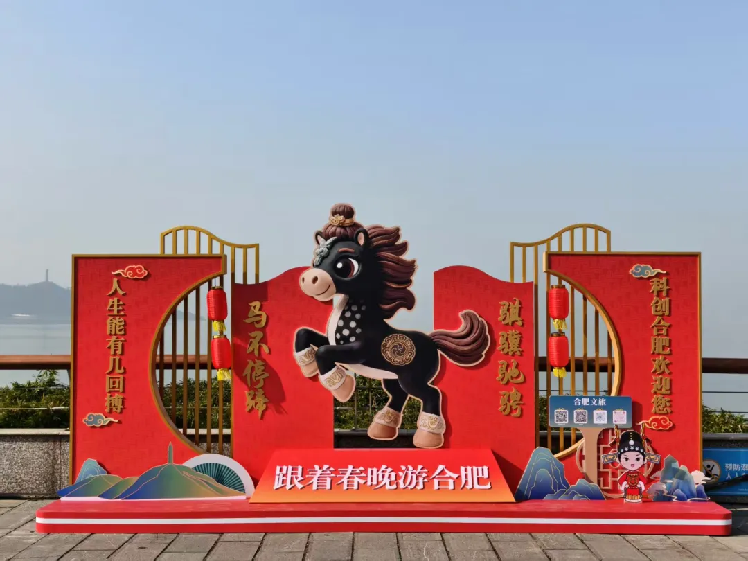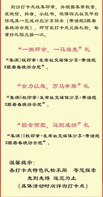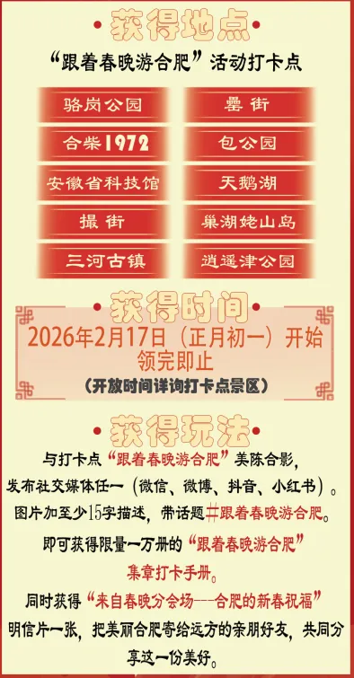 套圈区加油声此起彼伏——凭船票领圈、转发推文再加码,游客大展身手,现场欢呼不停。现场领取马年手作材料包,小朋友们兴奋地要为父母制作新年礼物,妈妈笑说:“这是今年最贵重的年礼。”跟着春晚游合肥——集章打卡,获得来自春晚分会场合肥的新春祝福。