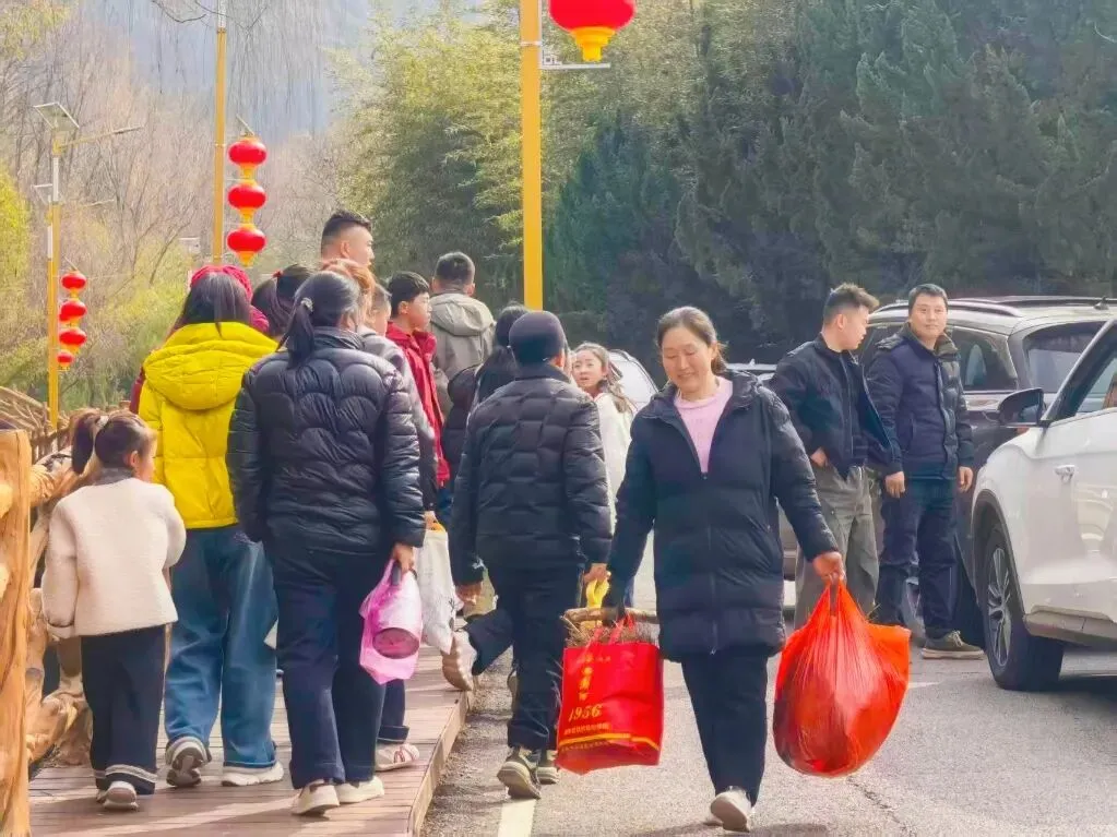张灯结彩迎宾客,山水含福过大年。景区内红灯笼高挂、年味氛围感拉满,处处洋溢着喜庆祥和的节日气息。各地游客携家带口、结伴而来,踏青赏景、打卡祈福,在青山绿水间感受浓浓年味,欢声笑语洒满山谷。