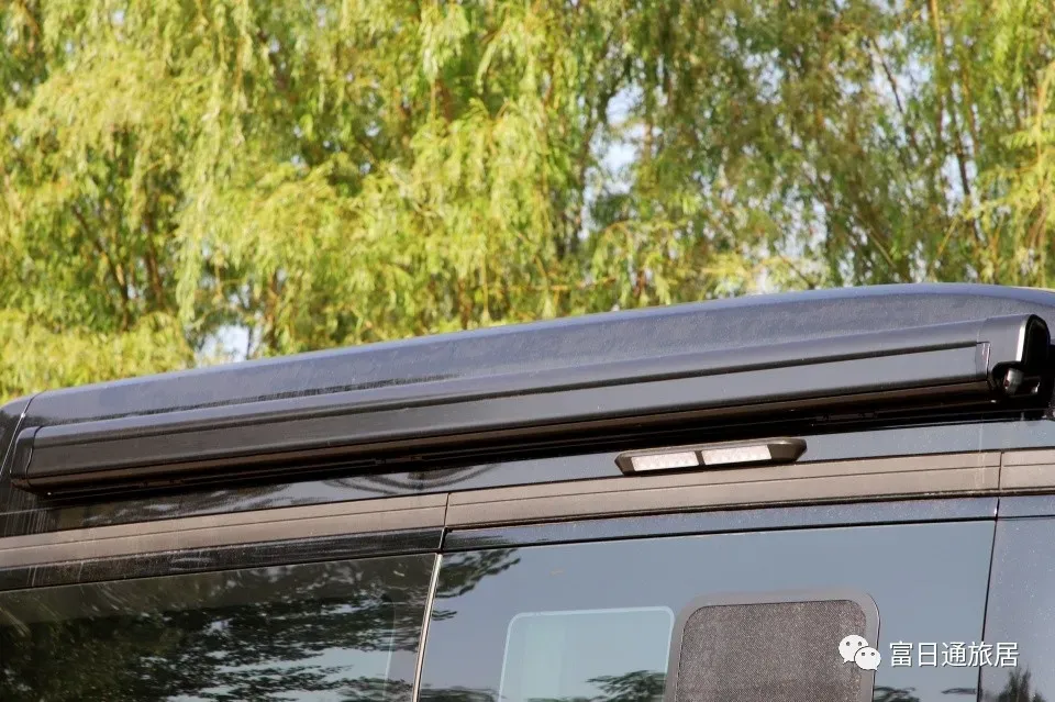 右侧车顶配2.5*2m的手动遮阳棚,下方安装LED户外照明灯。