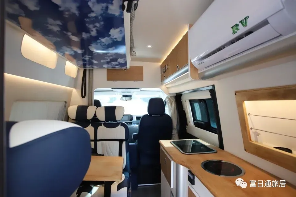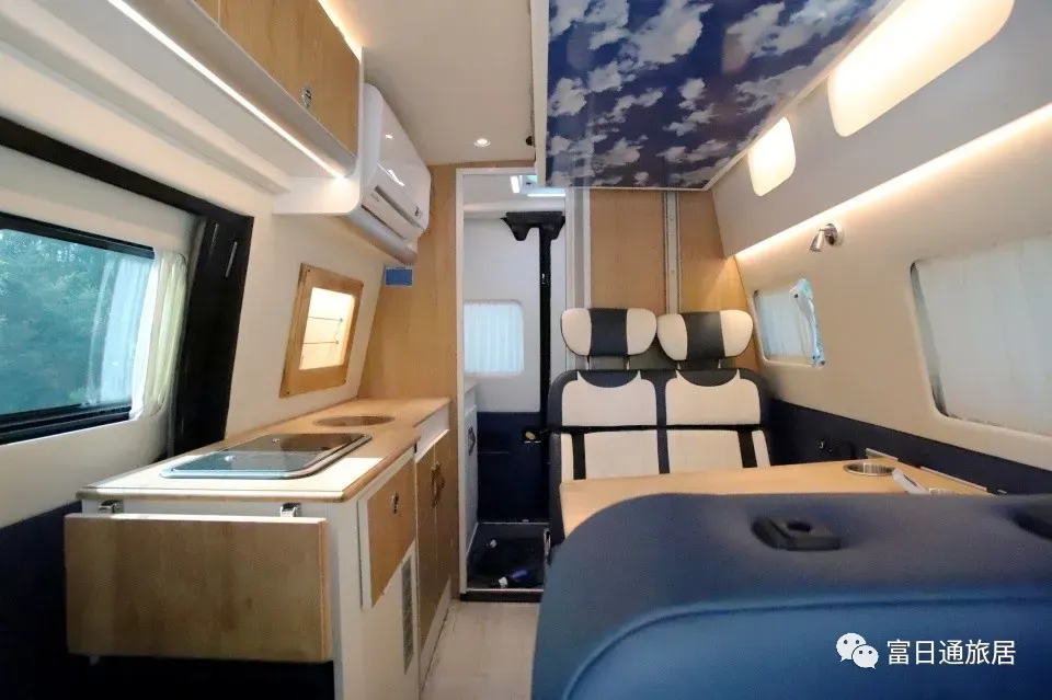 车内部分,雪豹1号整体采用木色、蓝色、白色等较为清亮的颜色装饰车内,并采用前生活区加后置封闭卫生间布局设计,整体以模块化理念塑造成型,每个功能区一看就知道干什么用的,主打一个使用方便,空间够足,住着温馨。父母在车内生活不仅舒适,节假日或者寒暑假组织家人出去玩也不显得拥挤。