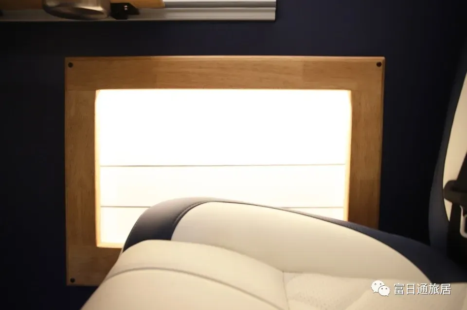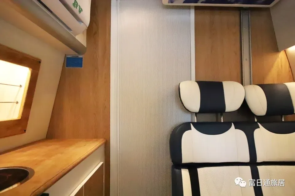 车尾,前文提到过,生活区与卫生间采用封闭式设计,用一扇百褶门把两处隔开,日常使用不耽误,也能有效隔开卫生间气味儿和水汽等。