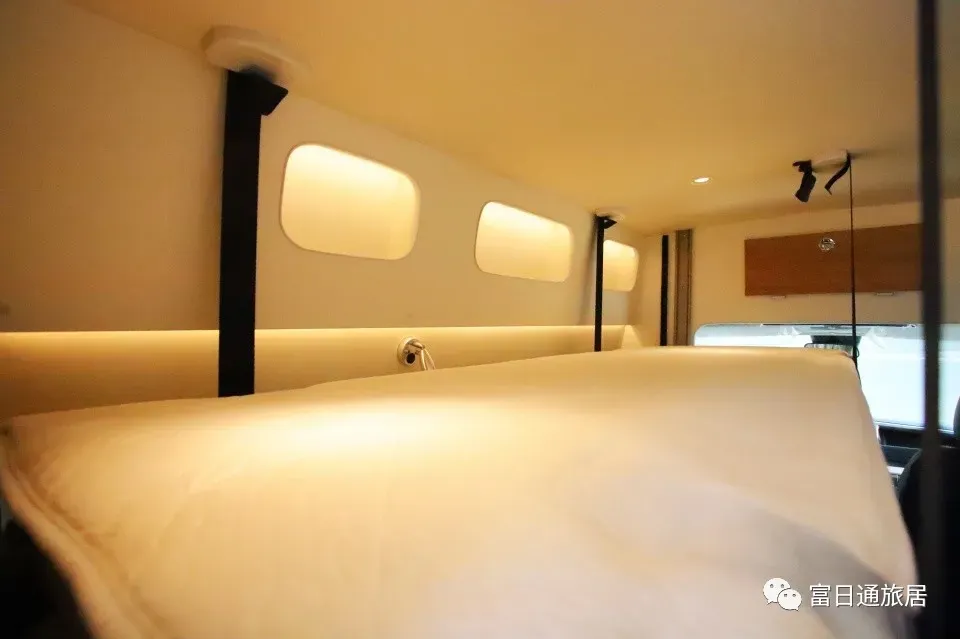会客区顶部,雪豹1号还安装一部电动升降床,来满足多人睡觉的需求。床铺尺寸为0.75*1.75m,内侧带有储物格,用于放置随身物品。