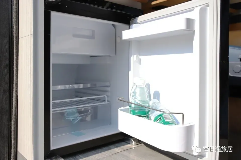 厨房侧面隐藏一台50L双开门静音房车专用冰箱。
